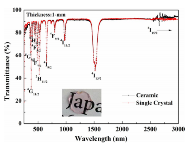 Er:CaF2陶瓷和前驱体单晶常温线性透射光谱图