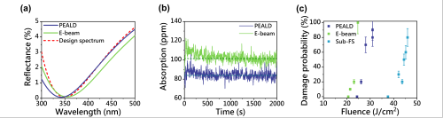 图2 等离子体增强原子层沉积(PEALD)和电子束沉积(E-beam)减反射薄膜的性能对比。(a)反射光谱,(b)膜层吸收,(c)激光损伤概率。