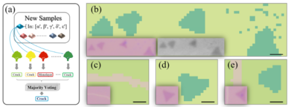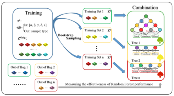 该研究中,研究人员利用MoS2的Raman频率、强度等特征信息,通过重采样过程,得到了包含不同空间位置信息的子训练集;通过学习过程,建立了由一定数量决策树组成的随机森林模型。当有新的样本点进入模型进行预测和判断时,随机森林中的每棵决策树会进行独立判断,继而通过多数表决的方式给出相对准确的预测结果。除了能够判断单层和双层样品外,模型还能够对样品生长过程中易引入的裂痕和随机分布晶核进行预测。该研究工作提出的方案将机器学习算法引入二维材料光谱学的研究中,也可扩展到其他材料,为不同领域的材料表征提供解决方案。