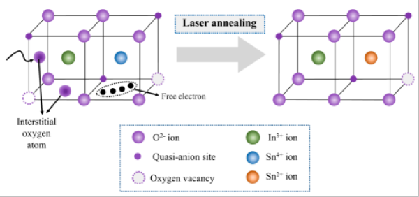 鉴于ITO薄膜的导电性和近红外波段的透过与载流子浓度相关,研究团队开展1064nm QCW激光退火技术对ITO薄膜载流子浓度的调控研究。结果表明,在QCW退火可有效降低ITO薄膜内的载流子浓度,在基本不改变ITO薄膜导电性的前提下,实现ITO薄膜近红外波段透过率的显著提升。能谱分析表明,载流子浓度的降低是由于QCW退火过程中发生了锡还原和氧空位湮灭过程。其中,锡的还原反应在靠近薄膜底部的缺氧环境中更为显著,而氧空位的湮灭程度基本不随膜层深度的变化而变化,这与锡还原过程提供的氧一定程度上弥补了薄膜底部相对于表面的缺氧状态有关。