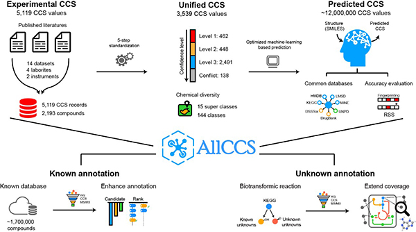 相关成果以Ion Mobility Collision Cross-Section Atlas for Known and Unknown Metabolite Annotation in Untargeted Metabolomics为题,发表在《自然-通讯》上,博士研究生周智伟为第一作者。AllCCS平台已免费向学术用户开放。研究得到国家重点研发专项、国家自然科学基金委、中科院、上海市科委等资助。