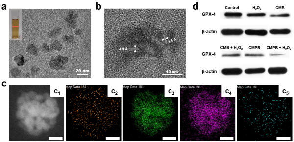 CMBP纳米颗粒的(a)TEM照片(插图为CMBP分散在水中的数码照片);(b)HRTEM照片;(c)(c1)CMBP的STEM图;(c2-c5)分别为Cu、Mn、O、Pt的元素面扫结果(标尺为10 nm);(d)不同条件下4T1细胞GPX-4酶的表达结果