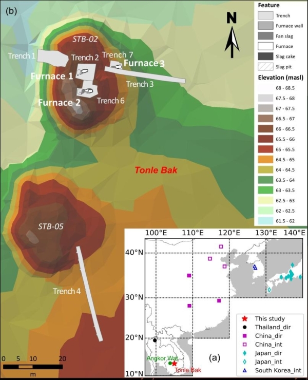 东南亚地区正是上述全球数据匮乏区之一。中国科学院地质与地球物理研究所副研究员蔡书慧联合美国加州大学圣迭戈分校教授Lisa Tauxe、美国芝加哥伊利诺大学副教授Mitch Hendrickson、澳大利亚14C定年专家Quan Hua和柬埔寨考古项目组等,对位于东南亚柬埔寨北部的一处古代冶铁遗址(Tonle Bak)开展了考古磁学研究,获得了该地区首批地磁场全矢量数据。该研究改善了全球考古磁学数据结构,记录到地磁场负异常,为认识低纬度地区地磁场特征及核幔边界结构提供了新思路,并为今后相关区域考古磁学工作提出新方向。