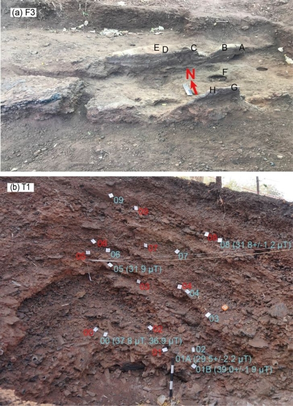 图2.(a)代表性窑址(F3)定向样品采样照片。图中字母代表定向样品采集位置;(b)代表性发掘沟(T1)非定向样品和碳屑采样照片。蓝色数字为非定向样品采集位置,旁边括号中为样品记录的古强度值,红色数字代表碳屑采集位置