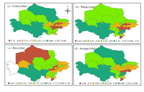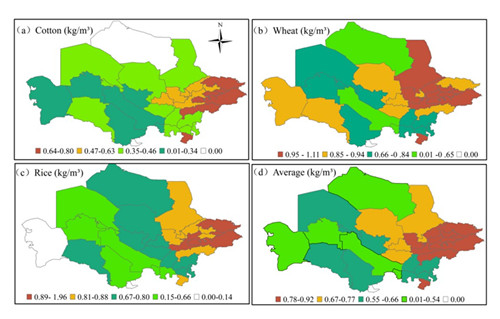 研究结果显示:(1)咸海流域的水域面积从2000年的2.5%下降到2014年的1.5%,平均以每年1048平方公里的速度下降,尤其是咸海的水体面积缩小最快。(2)咸海流域的主要作物棉花、小麦、水稻、玉米总面积约占整个灌溉农田面积的49%,棉花面积约占23%。小麦的年均单产最高,为4.16吨/公顷,其次是水稻2.27吨/公顷,棉花单产最低,为2.22 吨/公顷;空间分布上,锡尔河沿岸的灌区大于阿姆河沿岸灌区,上游灌区大于下游灌区,其中,费尔干纳谷地灌区和塔什干灌区的土地资源利用效率最高。(3)咸海流域作物的水资源生产力研究显示,棉花的水资源生产力最高,年均消耗每立方水创造0.727美元价值,其次是水稻,年均消耗每立方水创造0.268美元,小麦的水资源生产力最低,为年均消耗每立方水创造0.191美元;空间分布上,三种主要作物较高的水资源生产力同样集中在西北部的费尔干纳灌区和塔什干灌区。