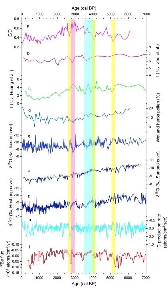 结果显示,距今6100年以来,该区周边山地为常绿和落叶阔叶林植被。该区湿度和温度变化在距今3600年以来都表现出更大的变率。湿度有长期下降趋势并有显著的干旱事件,可能与热带辐合带(ITCZ)的移动有关。最暖时期出现在距今2900年左右,在5100年和2700年左右有两次显著的降温事件,应该与当时太阳活动显著减弱有关。自距今800年左右开始,木本植物显著降低,但一些果实可食用树木被选择性保存下来,蕨类显著升高,草本植物显著增加,碳屑显著增多,侵蚀增强,都表明人类活动对本区环境造成了显著影响。该区相对较晚出现显著人类活动,可能与区域内高山地形和丰富河流水系易受洪涝影响或该区人口和土地资源压力出现较迟等有关。