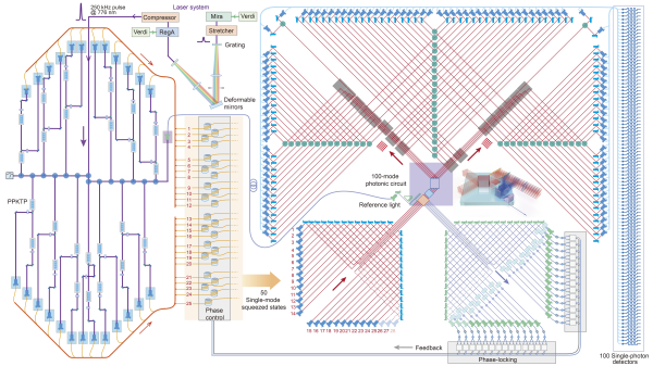 “九章”量子计算原型机光路系统原理图:左上方激光系统产生高峰值功率飞秒脉冲;左方25个光源通过参量下转换过程产生50路单模压缩态输入到右方100模式光量子干涉网络;最后利用100个高效率超导单光子探测器对干涉仪输出光量子态进行探测。