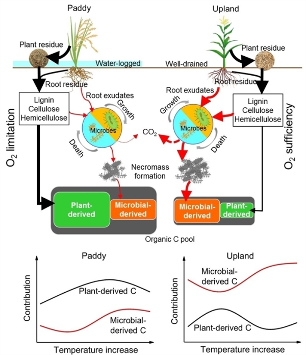稻田是地球上最大的人工湿地生态系统。同一个小的地貌单元内,稻田和旱地错落分布,具有相似的母质和气候条件。通常,旱地土壤有机碳含量较低,而相邻稻田土壤却具有突出的有机碳固持能力。解析稻田和旱地土壤有机碳来源和稳定性、阐明两类土壤有机碳固持途径,可为农田土壤有机碳库管理提供有力科学依据。