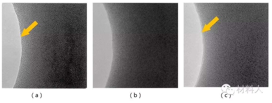图六 碳膜孔洞边缘在(a)欠焦(b)正焦(c)过焦状态下的拍摄图片