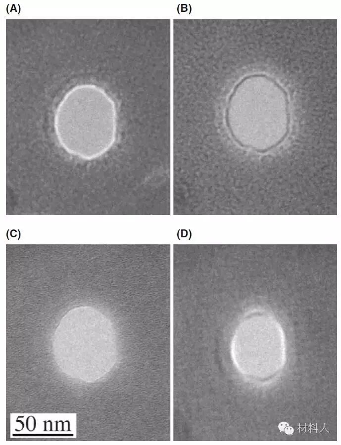 图七 非晶碳膜孔洞在(A)欠焦(B)过焦(C)正焦(D)有物镜像散的低倍透射照片
