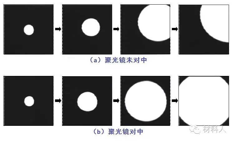 图四 (a)聚光镜光阑未对中的情况和(b)聚光镜光阑对中完成的情况