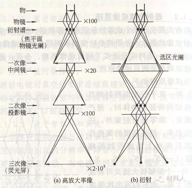 图二 TEM中成像(a)和成衍射谱(b)的光路图