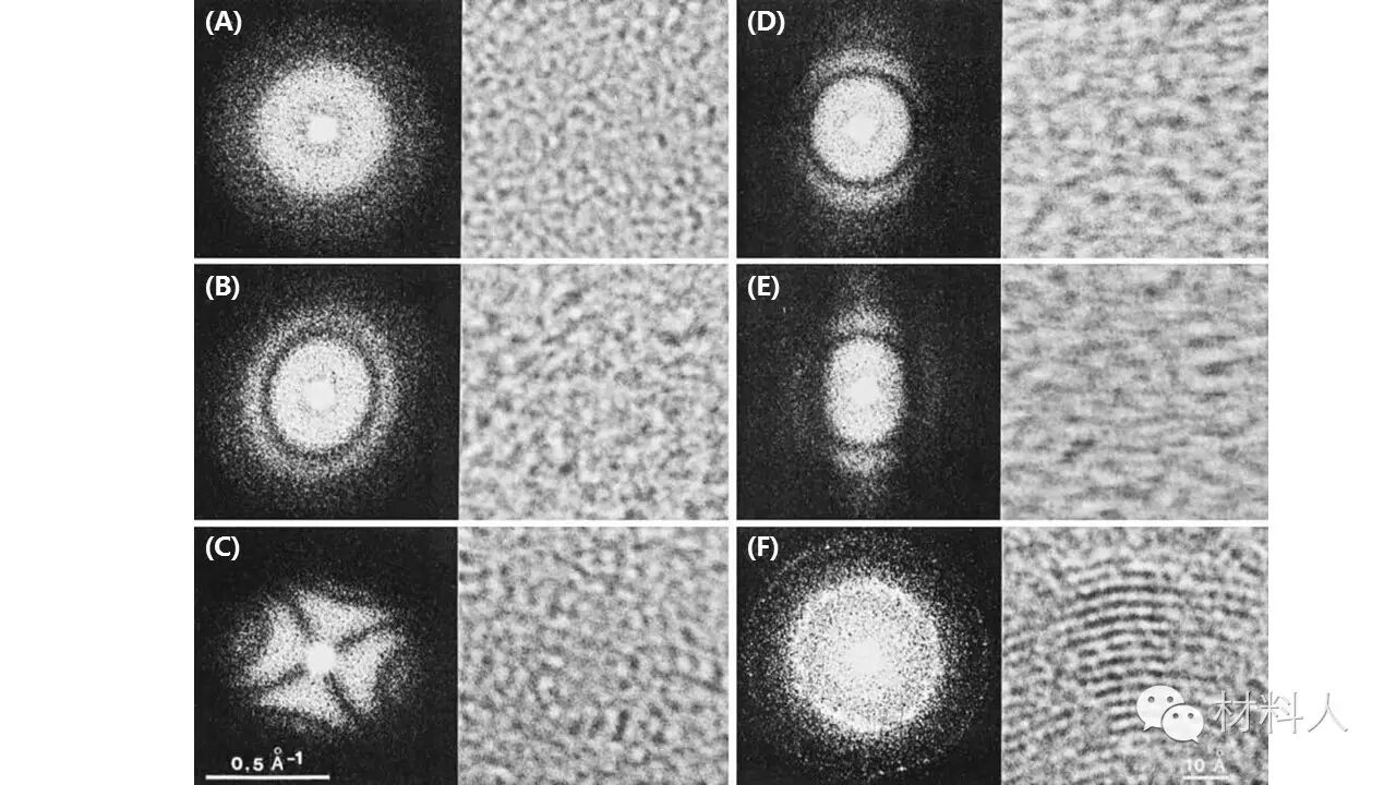 图八 碳膜非晶区在(A)无像散无漂移(B)有像散(C)严重像散(D)无像散有一点漂移(E)无像散有更大的漂移(F)无像散无漂移情况下的高分辨照片和对应的FFT花样