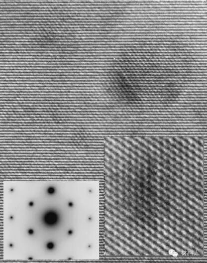高分辨电子显微像是让物镜后焦面的投射束河若干衍射通过物镜光阑,由于他们的相位相干而形成的相位衬度显微图像。由于参加成像的衍射束数量不同,得到不同名称的高分辨像。如图九中,固溶态Al-Si合金的二维晶格像,就是利用透射束加二维方向衍射束显示出来的。