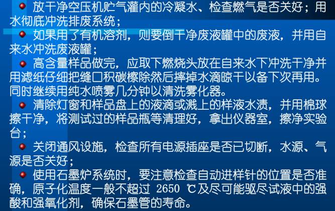 关机及分析结束后:放干净空压机贮气灌内的冷凝水、检查燃气是否关好;用水彻底冲洗排废系统;