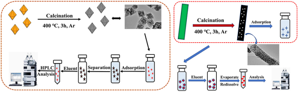 科研人员使用溶剂热法制备金属有机框架(MOFs),如MOF-235和Ni-MOF,以其为牺牲模板通过直接高温煅烧法制得MOFs衍生化磁性碳。在MOFs热解过程中,MOFs既是催化剂又是碳源,空间约束效应和配位键断裂释放的能量有助于有机组分的活化和碳纳米颗粒的重组。磁性颗粒与碳基质紧密接触使材料具有较好的分散性。MOFs衍生化磁性碳材料表面嵌入的碳基体使得其与目标物的苯环之间形成强烈的π-π和疏水相互作用。随后,科研人员将获得的磁性三维框架碳应用于磁性固相萃取中,结合高效液相色谱法建立了对环境和食品中苯甲酰脲类农药残留的检测方法,并获得了良好的萃取效果和方法适用性。该方法材料制备简单高效,缩短了萃取时间,并且减少了萃取剂用量,为磁性碳纳米材料的制备开辟了新途径。