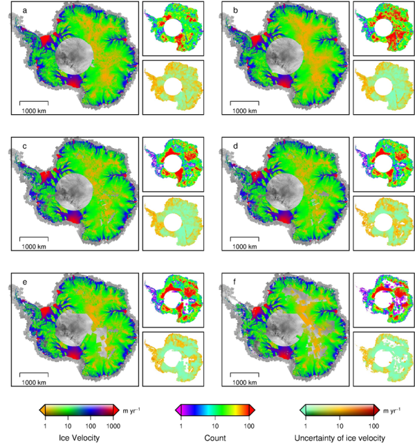 南极冰盖Landsat 8 冰流速产品(2013-2019)。a-f 对应2013-2019年的年度冰流速,每个年度冰流速图附带影像数量图(上)和不确定性图(下)