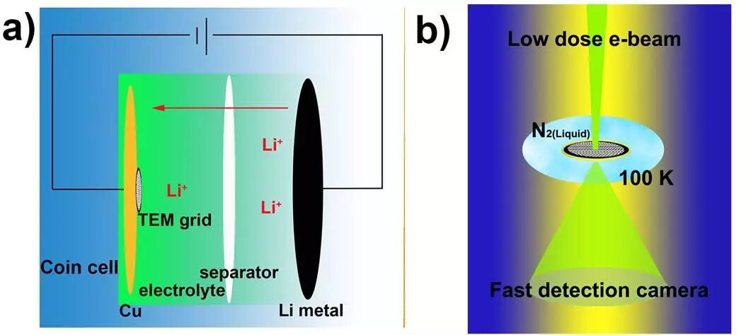 图3. 电化学沉积金属锂的样品制备示意图及其用冷冻电镜观察的示意图