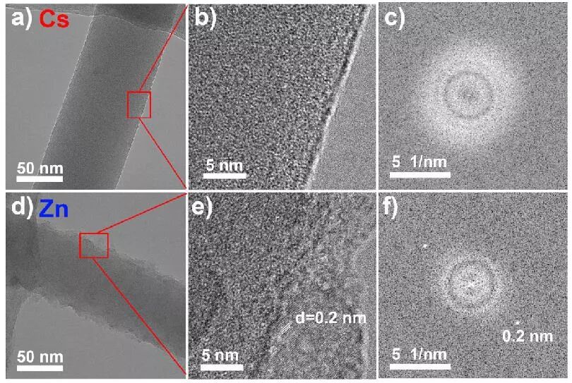 图5. 沉积于含有Cs+ (a-c) 和Zn2+ (d-f)添加剂的电解液金属锂的微观形貌