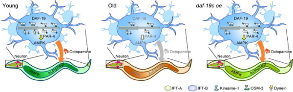 该研究中,研究人员以线虫为模式生物,通过高速活体显微摄影发现衰老通过下调转录调控因子daf-19/RFX降低多个IFT复合物组分的表达进而降低了IFT的速度与频率。进一步研究发现,老年线虫IFT的速度和频率的下降导致纤毛的功能减退,使得感觉能力随衰老下降,并进一步通过神经递质章鱼胺抑制了线虫体内各组织中的AMPK信号通路、扰乱了代谢稳态。在此基础上,研究发现,人为上调daf-19可以有效地延缓纤毛的衰老,在老年线虫中增强IFT、改善感知能力。这一针对纤毛衰老的干预更能有效上调老年线虫体内的AMPK和自噬作用的活性,促进代谢稳态的维持,延长线虫的寿命。