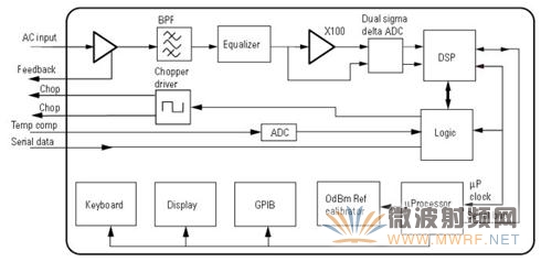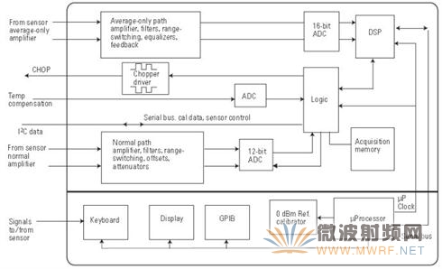 图8给出了具体仪器的原理框图。峰值功率计可以测试平均功率和峰值功率,所以传感器也有两个通道。功率计则更象示波器,直接高速采样,测量检波后的波形。