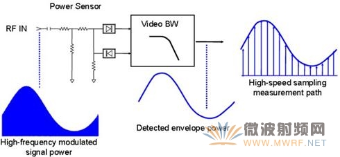 一些专用功率计可以用于测量脉冲调制信号,它们往往包括与示波器相似的显示器,以给出测得的结果随时间的变化。检测元件通常设计成具有快速输出响应时间的二极管。这类传感器的输出精确地仿效已调信号的包络,而与这类传感器配用的功率计则兼具连续波功率计和示波器的特性。如下图所示。