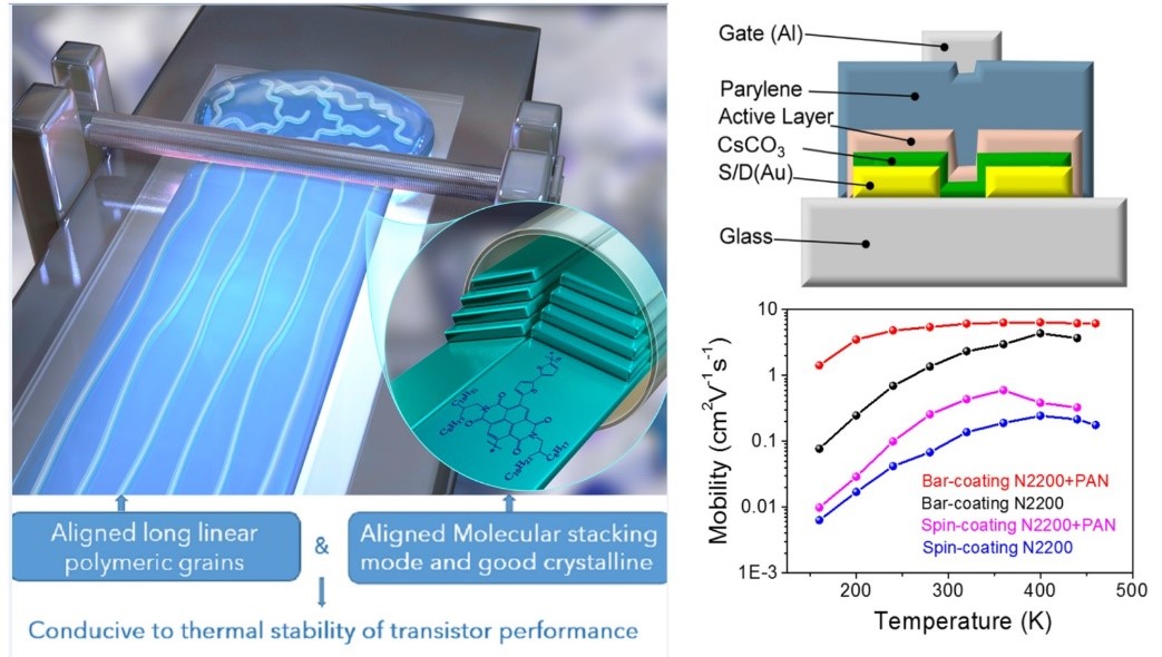 最近,科研人员发现添加聚丙烯腈(PAN)不仅可以调控分子的预聚集状态,还可提高聚合物溶液的可加工性。科研人员进一步结合棒涂法,制备出高度结晶和缺陷较少的聚合物分子薄膜。基于该薄膜的OFET器件,沿着晶畴取向方向的电子迁移率提升到5-6 cm2V–1s–1,相比于旋涂法制备的薄膜FET性能(迁移率0.1-0.2 cm2V–1s–1)有较大提升。该器件在零下80摄氏度到200摄氏度表现出出色的冷-热稳定性,极大拓展了OFET在不同环境条件下的应用,打破了人们对电子传输型聚合物FET器件不稳定的传统认识。相关研究成果发表在Chem上,论文第一作者为博士姜莹莹,论文通讯作者为郭云龙、胡文平和刘云圻。