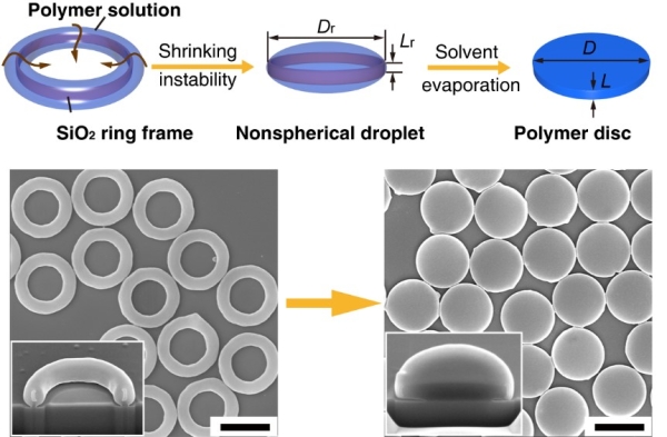 最近,在国家自然科学基金委员会和中国科学院的支持下,中科院化学研究所高分子物理与化学实验室研究员刘冰课题组提出了一种框架导向策略,制备出多种高分子胶体圆盘。科研人员开发了模板基的方法制备出单分散的SiO2胶体环(Angewandte Chemie International Edition 2017, 56, 9807),在此基础上利用合成的环状胶体,系统研究了胶体尺度的Plateau–Rayleigh不稳定性,并发现该不稳定性是合成Janus胶体和多patchy胶体的有效方法(Angewandte Chemie International Edition 2019, 58, 16884)。该研究进一步利用这些环形胶体作为框架控制液体环(聚合物溶液)的收缩不稳定性。科研人员设计路线在环形框架的表面引入聚合物溶液,形成环形的液体壳,通过控制条件抑制Plateau–Rayleigh不稳定性,使这些液体环不会断裂成小液滴,仅能自发收缩,这样的收缩通常导致球形液滴的出现,然而在环形框架的导向下,液体环能收缩成可控的非球形,最终诱导聚合物圆盘的形成(如图)。利用该策略制备的聚合物圆盘形状参数可调,该方法不依赖于特定的聚合物、溶剂或者框架,具有很好的扩展性,为聚合物胶体圆盘合成提供了有效的普适性方法。