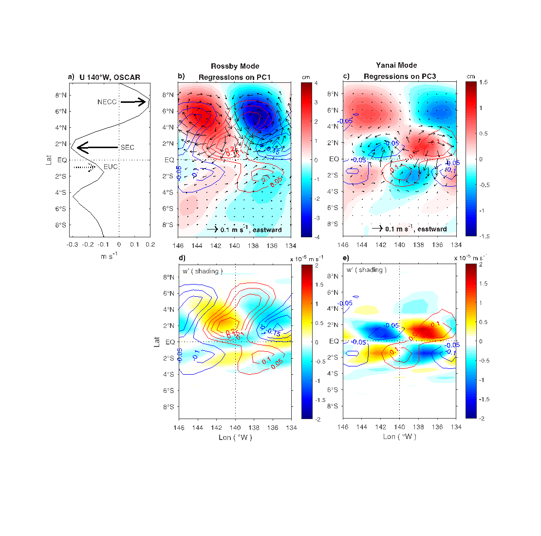 诊断的Rossby型(b,d)和Yanai型(c,e)TIW SSH(填色)、SST(等值线)、海表流场(箭头)与垂向速度(下排填色)空间模态