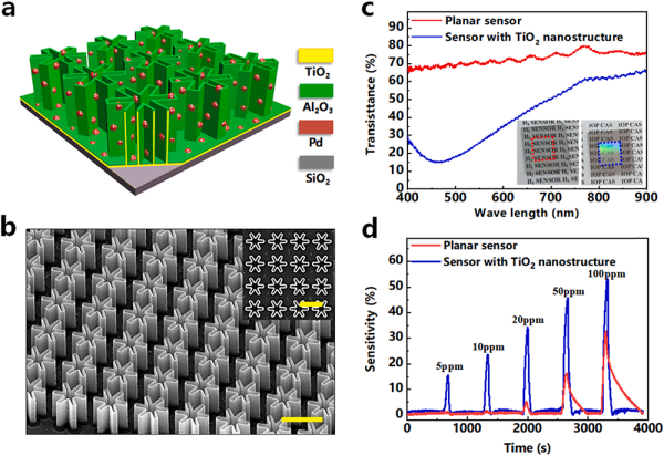 为了验证原子层组装加工方法的功能器件应用,研究人员利用该工艺,设计和制备出具有各向异性结构特点的全介质高效光学超构表面器件,通过高长径比纳米鳍状结构单元的不同角度旋转及错位排列,实现了对宽波段矢量光束的任意偏振调控(图4)。同时,还设计制备出具有高深宽比和大比表面积的Al2O3/TiO2复合的中空六角纳米结构阵列,并与Pd纳米颗粒相结合,基于异质界面二维电子气原理,构筑了高性能的氢气传感器(图5),获得的传感性能比传统的平面氢气传感器具有较大提升,尤其在较低温度所具备的高灵敏度和最短恢复时间,为高性能氢气传感器提供了理想方案。