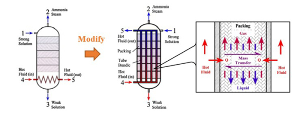 中国科学院理化所研究研究团队提出了全工艺链优化建站新思路(图a),以天然气液化过程的闪蒸气作为发电机燃料,以发电机余热驱动吸收式制冷替代现有的压缩式制冷作为预冷级,进而大幅提高能量利用率和液化效率。为了最大程度利用发电机余热,科研团队开发了新型吸收式制冷系统(图b),该系统采用具有自主知识产权的连续变温分馏发生结构(图c),通过热质耦合传递强化手段,实现了对天然气液化场站内燃机烟气和缸套水余热的高效回收,并提供-10℃的制冷量同时用于天然气和主冷级混合工质预冷。