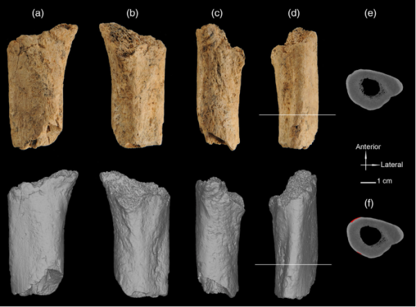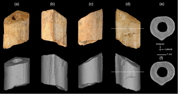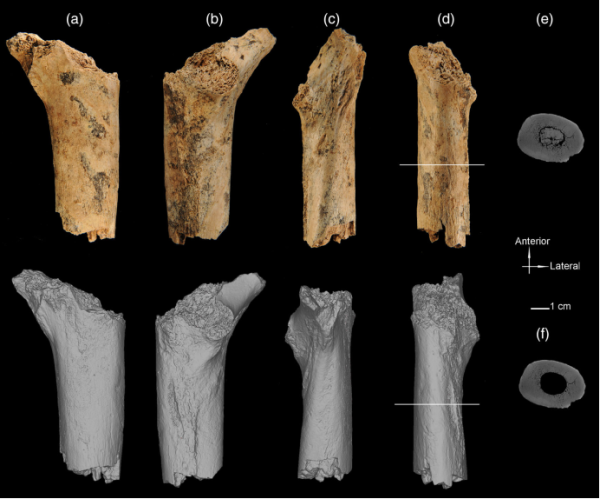 在华龙洞发现的人类化石中有三件股骨。作为华龙洞人类化石系列研究之一,研究人员对该地点出土的3件股骨(编号为HLD11、15、16)形态进行详细描述和对比。除传统的骨骼形态观测外,该研究还使用micro-CT扫描华龙洞股骨材料,获得特定位置的断面(80%和50%),并计算一系列生物力学参数,包括骨密质所占断面面积百分比(反映股骨轴向抗压力和张力的刚度)和截面惯性矩(反映股骨抗弯刚度)。
