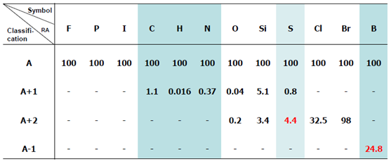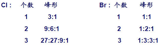 2). 从M+2 峰与M 峰强度的比值可估算出分子中含S,Cl,Br 的数目