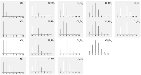 多卤化合物的分子离子峰可能不是峰簇中的最强峰。除溴化物和多氯化合物及特殊情况(如所含碳原子数超过100)之外,同位素峰簇中的最强峰为分子离子峰。