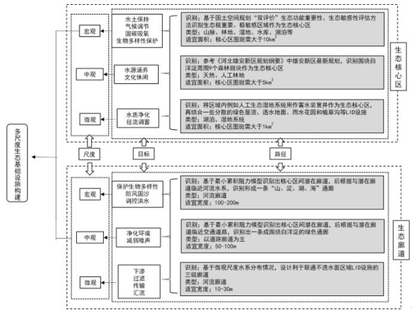 生态基础设施是保持、改善和增加生态系统服务的条件和过程,有利于提升区域生态系统服务能力。在结合现有研究以及生态基础设施规划方法基础上,中国科学院城市环境研究所科研人员基于ArcGIS、最小累积阻力(MCR)模型和层次分析法(AHP),构建一种“宏观-中观-微观”多尺度生态基础设施核心区识别和生态廊道辨识的方法体系框架(图1),为不同尺度的核心区和生态廊道提出建议规模和重点生态系统服务类型。