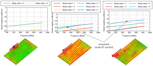 从图15可以看出:天线支节位于宽边时,非常容易激励出mode #2,馈电点位置最好位于中间,在此频段只有mode #2和mode #5, 且mode #2较mode #5大7 dB,期望!,其他馈电方式,会激励出更多模式,造成隔离度变差。