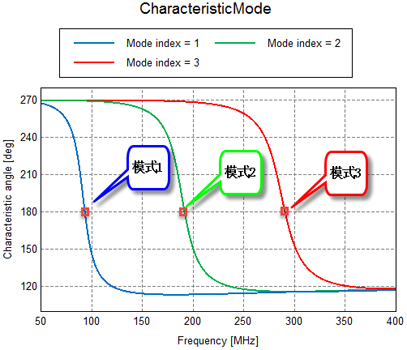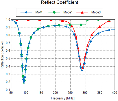 图3、反射系数随频率的变化曲线(蓝色曲线天线端口的总反射系数vs. 绿色曲线模式1反射系数vs. 红色曲线模式3反射系数)