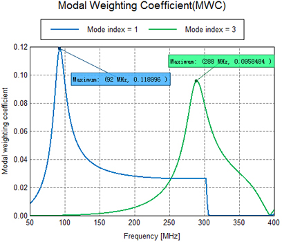 图4-1、模式加权系数随频率的变化曲线(蓝色曲线为模式1 vs. 绿色曲线为模式2)