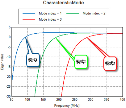 对于宽频带的特征模分析,进行模式跟踪(Mode tracking)[8][9]具有挑战,因为随着频率的变化,谐振模式会发生改变,初始的模式编号以起始频点的模式为准,按照能量有高到低进行编号,有些模式会随着频率的改变逐步消失(能量占用比率越来越小),有些新的模式会逐步出现。下边的例子中均应用到模式跟踪技术。还有一种模式跟踪处理技术是确定起始频率的几个模式,在整个宽频范围内只是跟踪这几个确定的模式,这种方式可能会丢失一些新的模式。