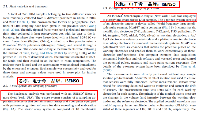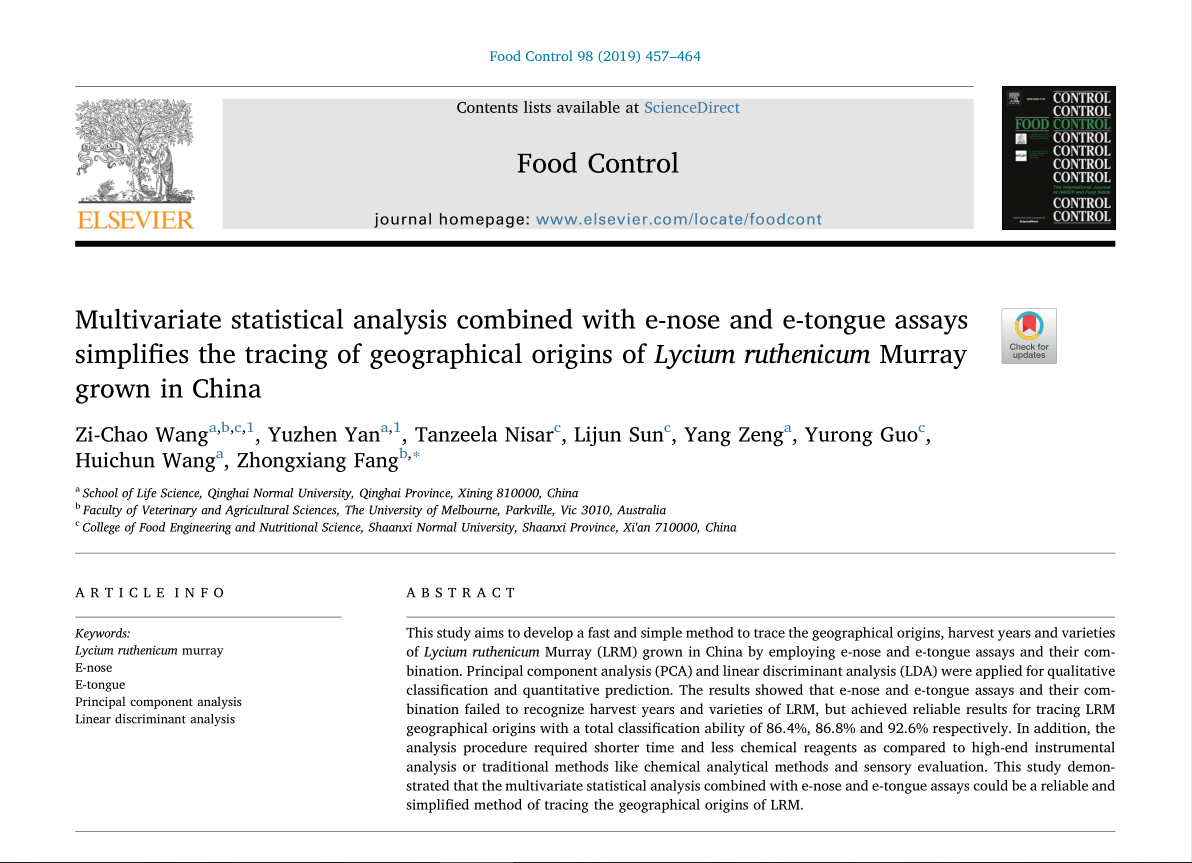 【摘要】本研究旨在开发一种基于电子鼻和电子舌试验及其组合的快速简便的方法来追踪在中国种植的黑果枸杞(LRM)的地理来源,收获年份和品种。应用主成分分析(PCA)和线性判别分析(LDA)进行定性分类和定量预测。结果表明:电子鼻和电子舌的测定及其组合未能识别LRM的收获年份和种类,但是在追踪LRM地理来源方面取得了可靠的结果,总分类能力分别为86.4%,86.8%和92.6%。除此之外,与高端仪器分析或传统方法如化学分析方法和感官评估相比,分析程序需要更短的时间和更少的化学试剂。这项研究表明,多变量统计分析结合电子鼻和电子舌测定可能是一个可靠简便的追踪LRM地理起源的方法。