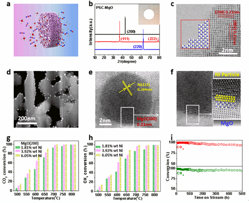 中国科学院福建物质结构研究所功能纳米结构设计与组装/福建省纳米材料重点实验室研究员谢奎课题组通过晶格重构策略制备出2厘米尺寸、具有三维连通孔道结构的多孔单晶MgO整体式催化材料,并在表面生长单晶Ni纳米颗粒构建了结构清晰的界面活性结构,有效活化碳氢键进而增强甲烷二氧化碳干重整性能。多孔单晶MgO整体式催化材料在700°C实现CH4/CO2的完全转化,运行500小时性能无明显衰减。多孔单晶整体催化材料对构筑表界面精细结构具有独特优势,对表界面催化机制研究具有重要参考意义。