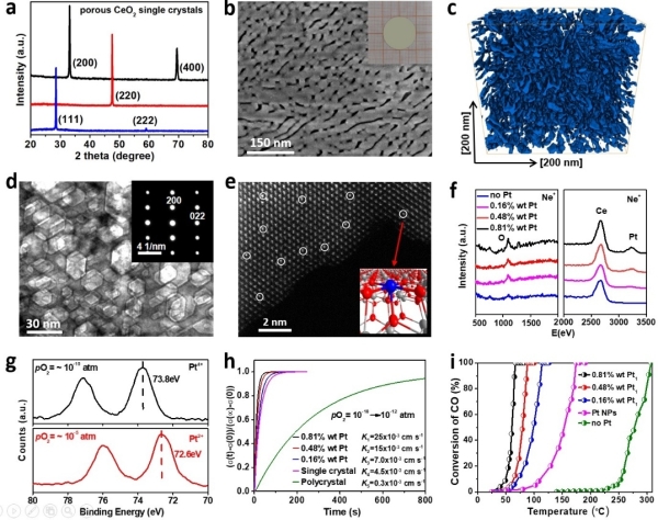 中国科学院功能纳米结构设计与组装/福建省纳米材料重点实验室研究员谢奎课题组通过晶格重构策略生长出了2cm尺寸的具有三维连通孔道结构的介孔CeO2单晶,并利用原子层沉积(ALD)技术在多孔单晶扭曲表面上构筑了清晰的单位点Pt1/CeO2活性结构。这种Pt1/CeO2局域结构显著提高了与Pt离子相连的晶格氧活性,在67 ℃时实现CO完全氧化,并且运行300个小时后无衰减。宏观尺寸多孔单晶可有效调控扭曲表面及精细结构,为后续在表面活性位设计与构筑提供了新策略。相关成果发表在《德国应用化学》上。