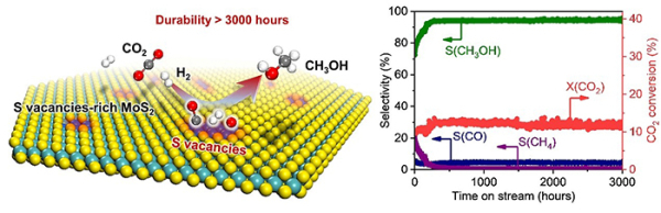 近日,中国科学院大连化学物理研究所催化基础国家重点实验室二维材料与能源小分子转化创新特区研究组研究员邓德会团队,与厦门大学教授王野团队合作,在二氧化碳(CO2)催化加氢制甲醇研究中取得重要进展,首次利用富含硫空位的少层二硫化钼(MoS2)催化剂,实现了低温、高效、长寿命催化CO2加氢制甲醇,其活性与选择性均显著优于商品Cu/ZnO/Al2O3催化剂,并显示出优异的稳定性。该催化剂为实现低能耗、高效率的CO2转化利用开辟了新途径。