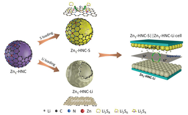 近日,中国科学院大连化学物理研究所催化基础国家重点实验室二维材料化学与能源应用研究组研究员吴忠帅团队与有机-无机杂化材料研究组研究员杨启华团队合作,发展出一种单原子锌修饰的中空碳球纳米反应器。该反应器可同时用作锂硫电池正极、负极的基体,提高对多硫化物的催化活性并抑制锂负极枝晶的生长,应用该反应器的高比能锂硫全电池具有高载量、高倍率、长循环的性质。