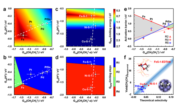 该工作通过研究两个维度的描述符(*C2H4和*H的吸附自由能),构建反应相图,统一Fe和Fe-S-1催化剂不同的反应机理。研究发现,金属催化剂Pt、Pd和PtSn的本征活性(转化率)受反应第一步乙烷脱氢(R1)的限制,而Fe位于R1、R3(乙烯脱附)和R4(氢气脱附)的交点处,即Fe的催化性能会受到上述三个步骤的同时影响。对于沸石S-1改性的催化剂,Ni-S-1和Cu-S-1的速率限制步骤是R4,而Fe-S-1恰好位于R1和R4的交界处,其相对较弱的H*吸附使得更容易生成氢气和脱附。该研究通过微观动力学模型从理论上统一金属和分子筛体系的反应收率,为非氧化脱氢反应催化剂的设计提供新方向。