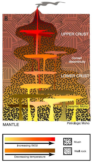 经典的火成岩理论认为岩浆房主要由液态的岩浆组成,这样的模型被用来解释大洋洋壳及大量深成岩体的形成。然而,地震学研究并不支持地壳中存在巨量液态岩浆,而物理模型也显示富含岩浆的岩浆房非常难在地壳中形成以及......