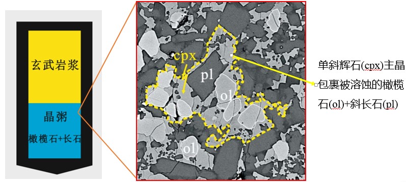 中国科学院广州地球化学研究所杨阳及合作者首次针对岩浆房中玄武质岩浆与晶粥的反应展开实验岩石学研究。实验采用干体系下玄武岩浆最初结晶的矿物(橄榄石和斜长石)作为晶粥组成,利用不同Mg#的玄武岩与其反应。实验过程中,玄武岩浆进入到橄榄石和长石组成的晶粥中,橄榄石和斜长石被熔体溶解,并在晶粥中形成新矿物:高Mg#单斜辉石(图2)。反应作用机制为溶解-再沉淀过程(dissolution-reprecipitation),反应公式如下:
