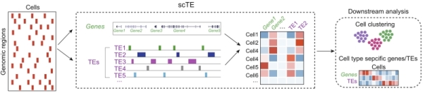 相对scRNA-seq研究转录组而言,单细胞ATAC-seq(scATAC-seq)等单细胞基因组技术研究的对象是染色质,染色质开放性与表观遗传修饰情况在较大程度上决定了基因表达丰度,以scATAC-seq为代表的单细胞基因组学技术的开发,让获得“高分辨率”的单细胞精度的染色质开放/修饰图谱变为可能,有利于构建从DNA到RNA再到表型的调控网络,寻找与表型强相关的核心调控因子。以scATAC-seq为代表的单细胞基因组测序数据存在以下特点:高维度。每个细胞中可以检测到可能开放的区域可达几十万个;数据的稀疏性。由于技术原因,导致大量开放的区域没有检测到信号。由于以上原因,目前对scATAC-seq数据的生物信息学存在较大的挑战。研究团队提出由于TEs多拷贝的特点,通过累积TEs信号可去除数据的稀疏性,降低数据的维度,或能够有效解决scATAC-seq数据中的两个难题。研究团队利用scTE,发现仅利用TEs信号,能够将scATAC-seq数据中主要细胞类型区分,提示TEs信息对scATAC-seq等单细胞基因组数据的分析是较好的补充。