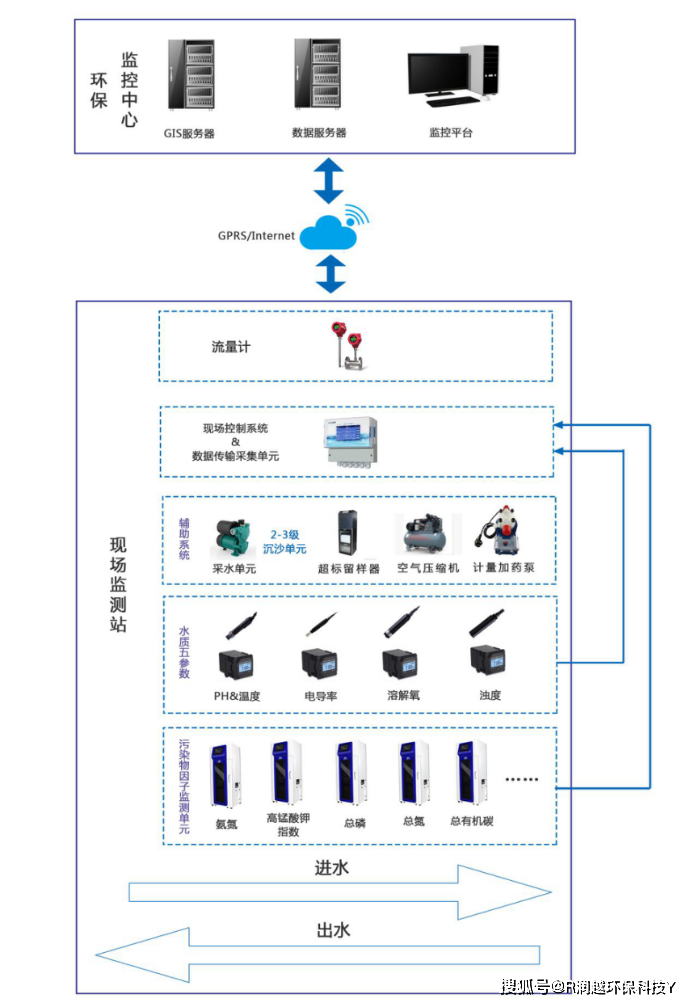 水质自动监测站主要由环境数据采集显示层、环境数据通信网络层、环境在线云平台层四部分组成。