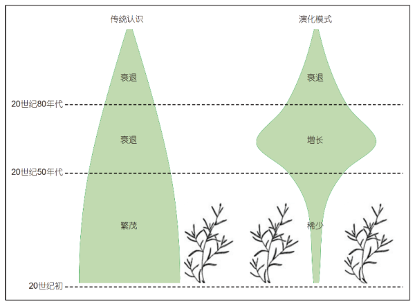 图2.东部地区浅水湖泊过去百年来沉水植被演化过程的传统认识以及可能的演化模式